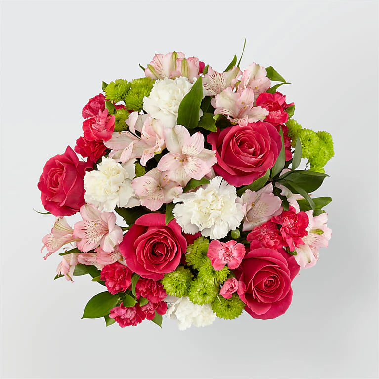 The true beauty of this bouquet shines through its soft, sweet hues. Featuring hot pink roses and pale pink alstroemeria arranged in a clear glass cylinder vase, it’s a joyful gift designed to brighten anyone’s day.