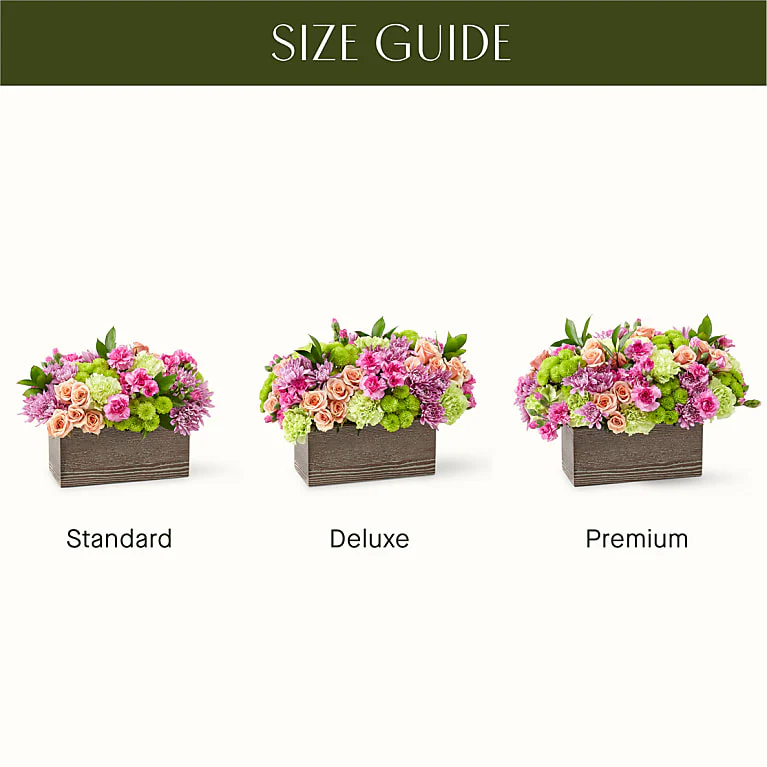 Capture the beauty of the season in full bloom with this elegant floral arrangement, featuring peach spray roses, green button pompons, pink mini carnations, and lavender cushion pompons, beautifully styled in a rustic wooden box. A perfect choice for expressing gratitude or sending heartfelt get-well wishes.