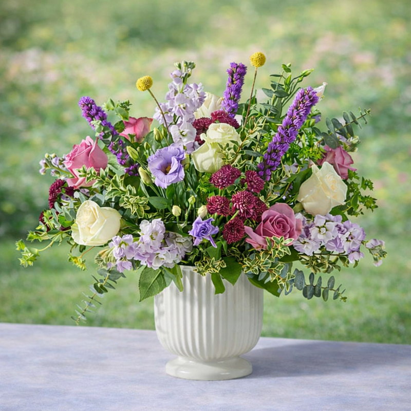 A true floral masterpiece, this grand bouquet blends rich purple, soft lavender, and elegant ivory blooms into a striking expression of thoughtfulness. Artfully designed to impress, it’s a beautiful way to let someone know they are in your thoughts, offering beauty, warmth, and heartfelt emotion through every carefully chosen stem.