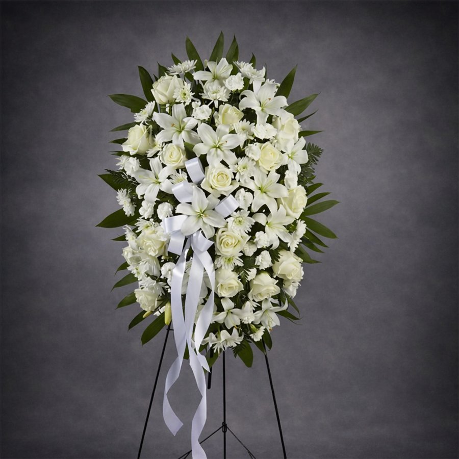 This elegant standing spray is a timeless expression of serenity and remembrance. White roses, Asiatic lilies, chrysanthemums, and mini carnations are artfully arranged with lush greenery and emerald palm fronds, finished with a white satin ribbon and displayed on a wire easel to honor a cherished life.